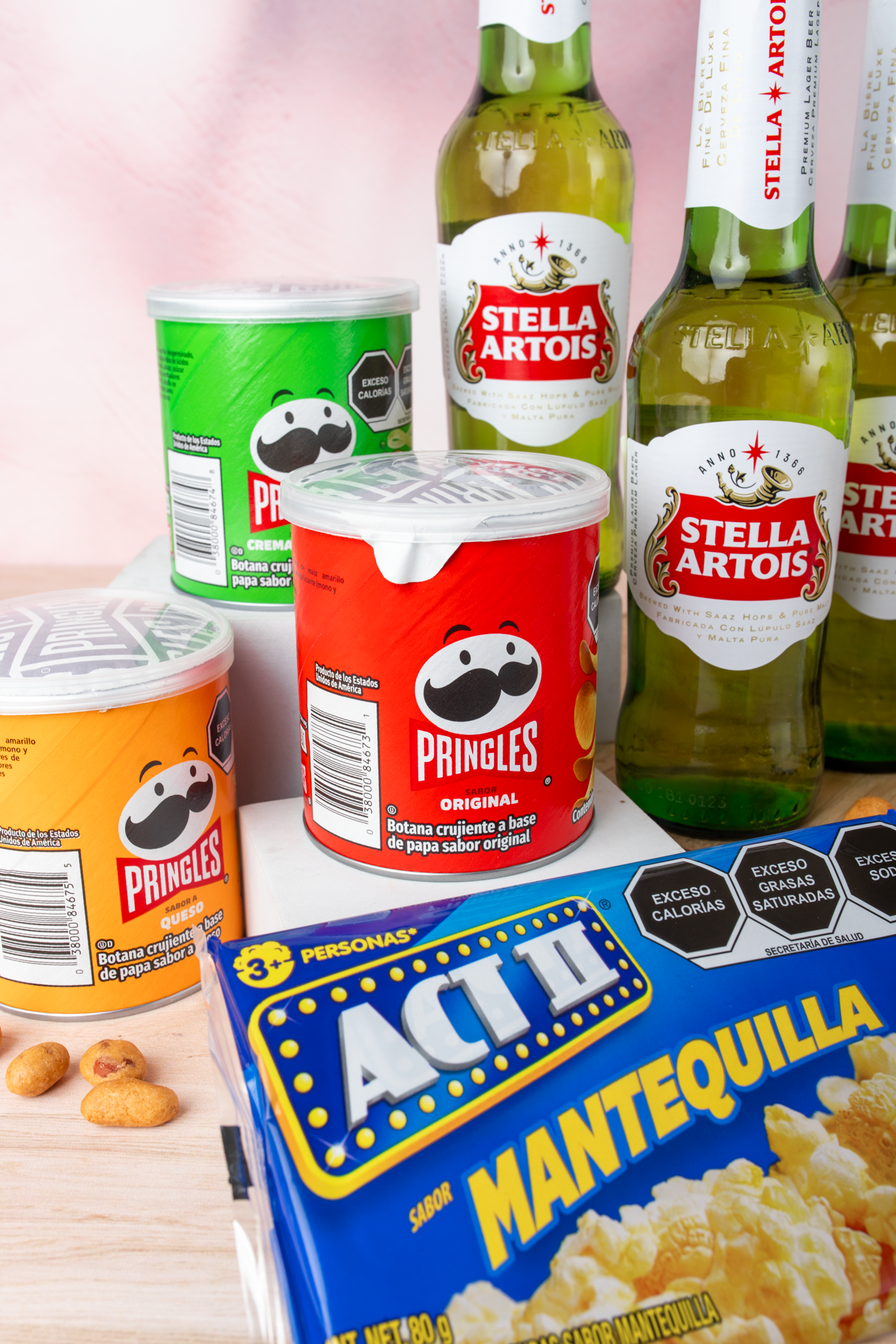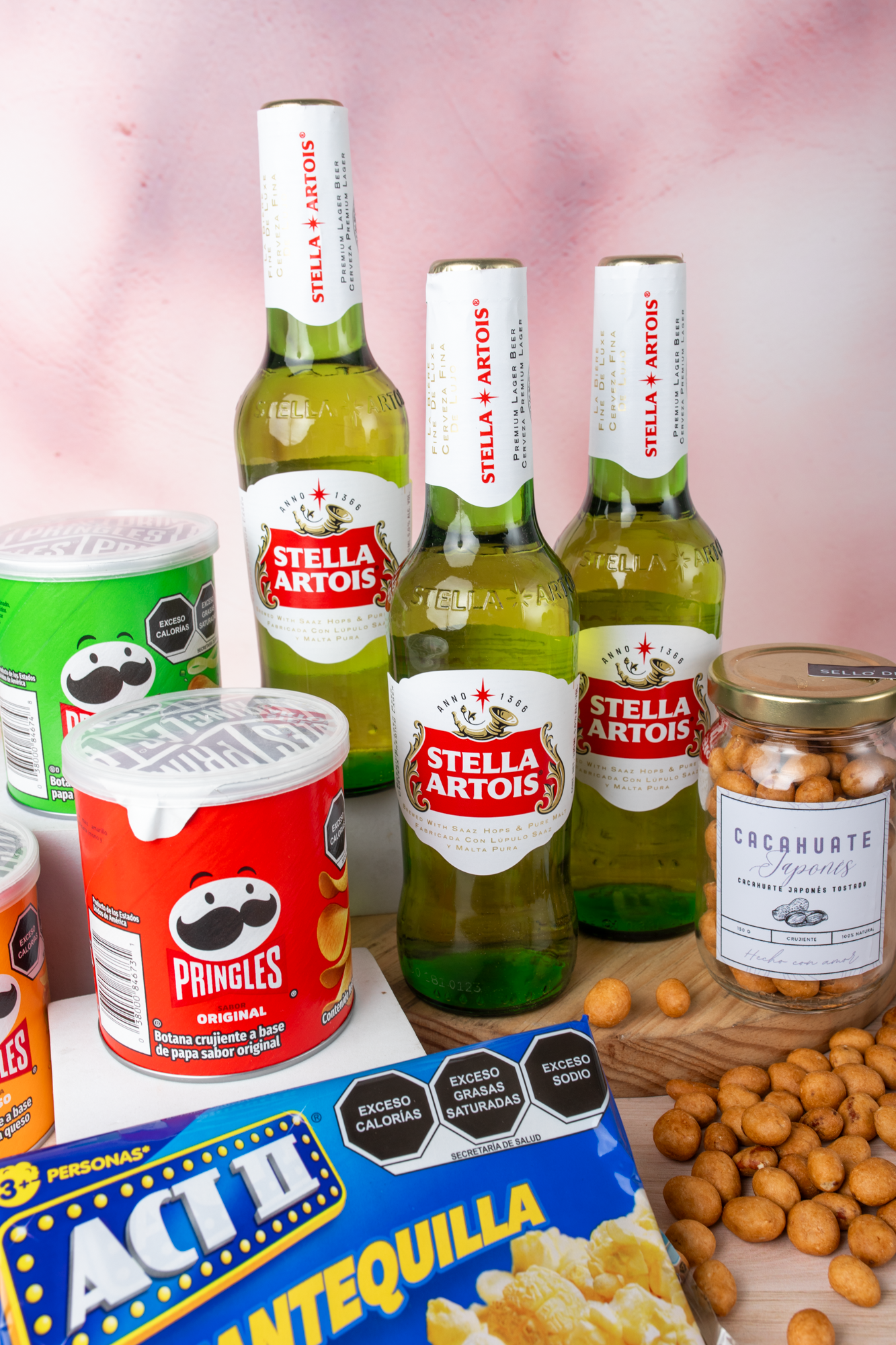 Este precioso arreglo de cervezas Stella Artois, cacahuetes, Pringles y Palomitas será un regalo fabuloso para tu ser querido.
