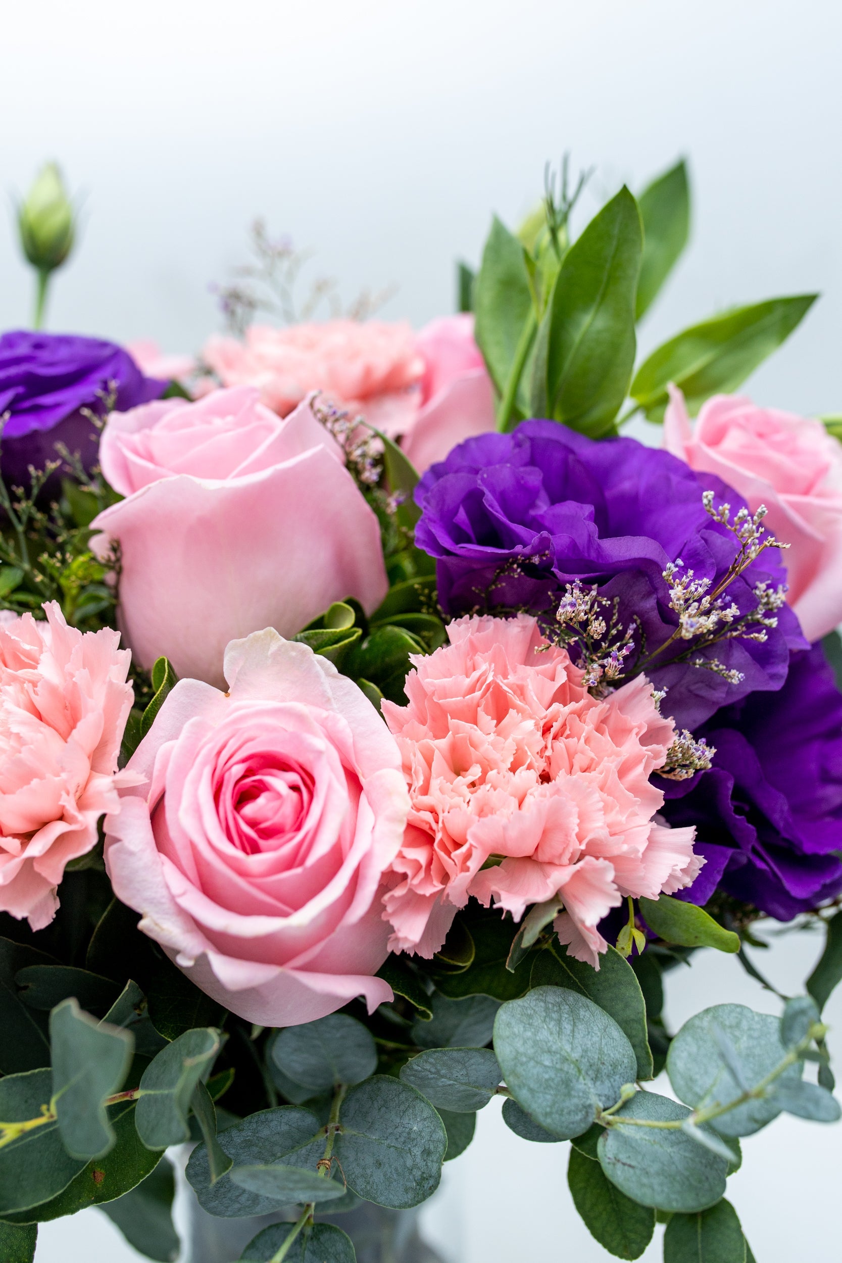 Disfruta de la nobleza y elegancia de nuestra combinación de rosas claras, lisianthus morados y claveles rosas. Perfectos para expresar amor, gratitud y amistad. Realza cualquier ocasión con su belleza y delicadeza. ¡Sorprende a tus seres queridos con la nobleza de estas flores!